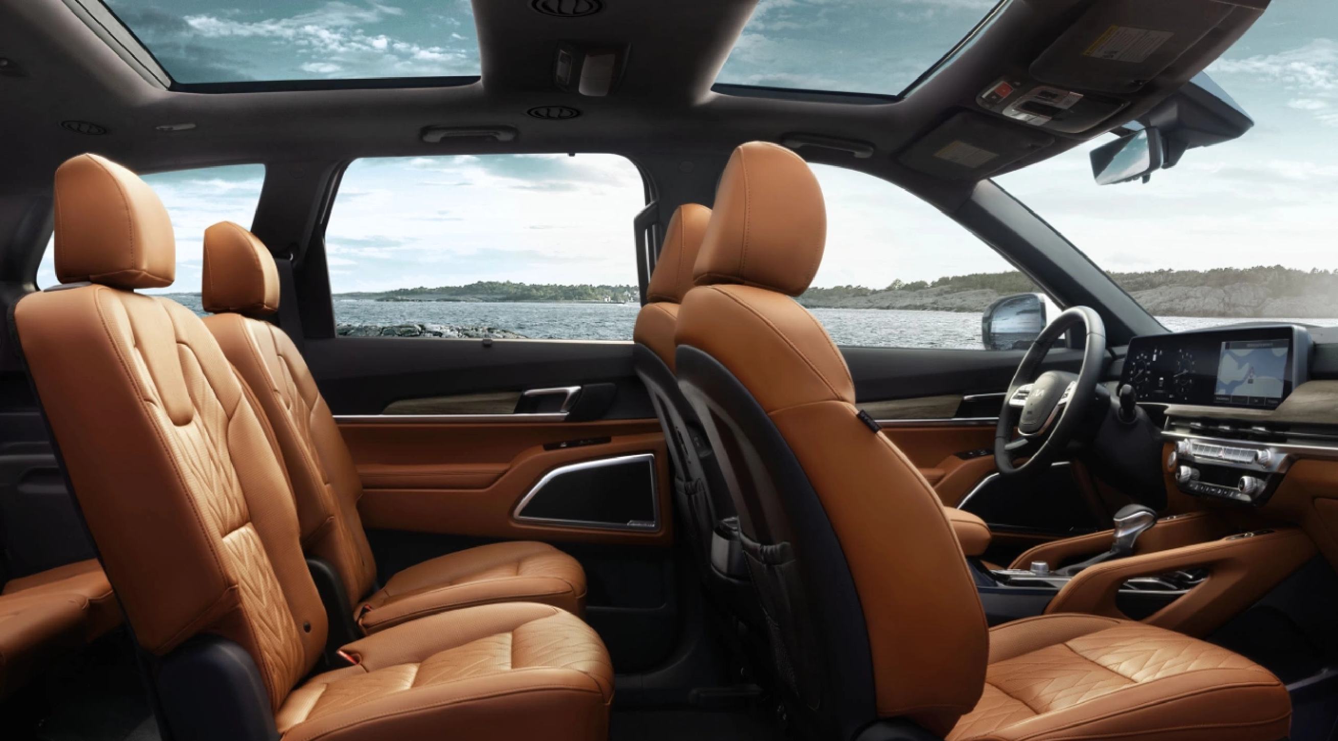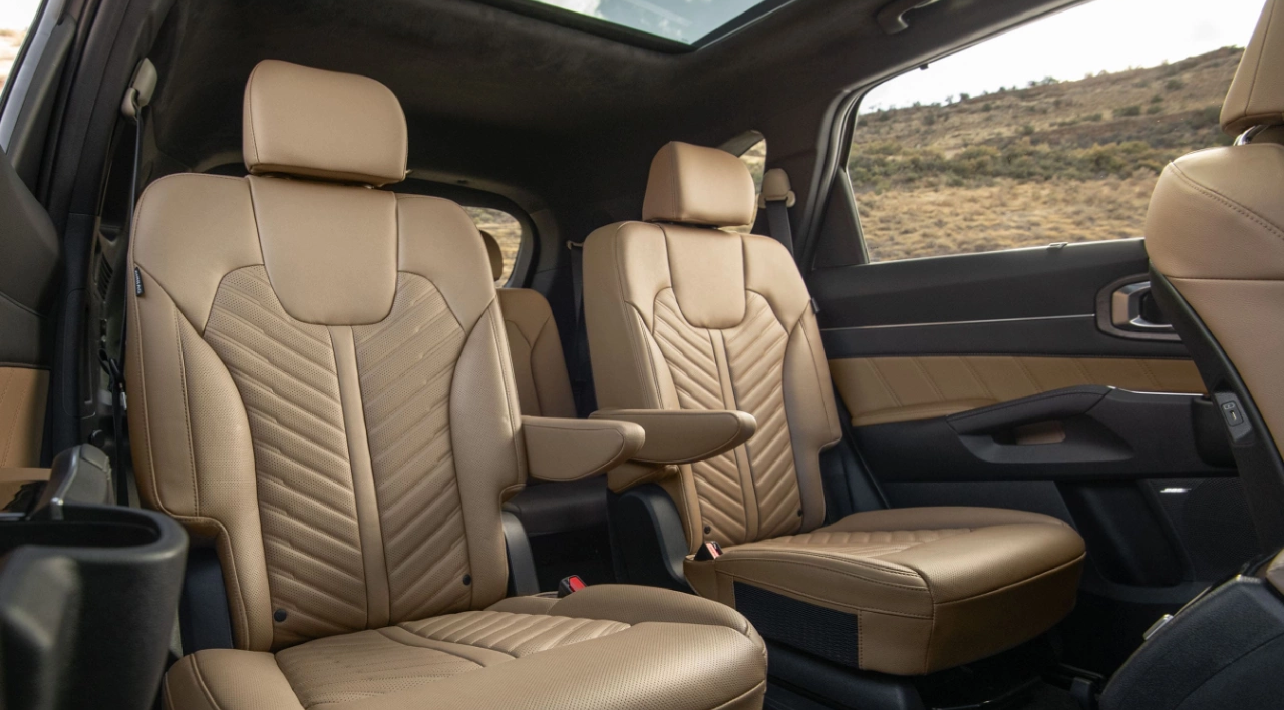 The third row in the Telluride is much more comfortable than most of the midsize competition. Adults can fit back there with lots of leg and headroom, so it is handy on road trips. The interior is premium in quality with upscale materials, optional Nappa leather seating, and features such as ventilated seats on both the first and second rows. The Telluride's dashboard and center console layout are easy to understand, and advanced driver-assistance features are included as standard, making it one of the safest vehicles in its segment.